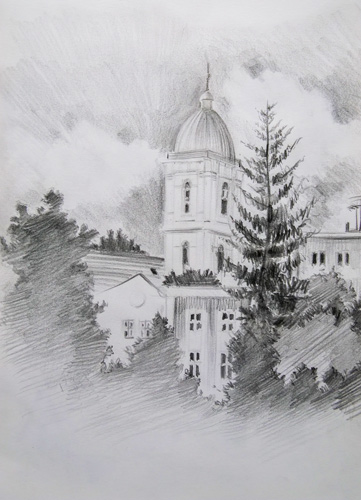 « Dans ce dessin, l’intérêt ne vient pas seulement du point focal — ici, le clocher — mais aussi de la profondeur créée par le premier plan. L’arbre, beaucoup plus sombre, joue ce rôle d’ancrage. Remarquez que le premier plan reste volontairement peu détaillé : ce sont les hachures qui suggèrent l’environnement, créent une dynamique, et donnent un style à ce dessin »