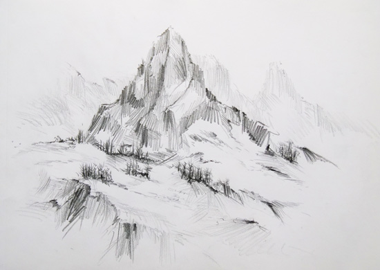 « Ici, la montagne est le sujet central : elle doit dominer la composition et attirer immédiatement le regard. À l’arrière-plan, une chaîne se devine à peine, simplement suggérée, tandis qu’un large espace vide entoure le motif principal. C’est précisément ce traitement qui renforce son importance et son impact. »