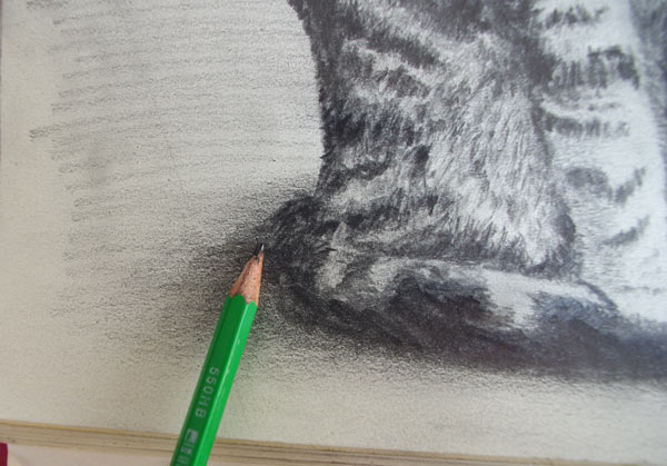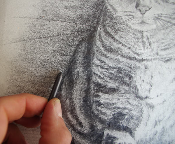 Nous allons donc reprendre la fourrure un peu partout (très légèrement sur la partie droite, très claire) avec la pointe du crayon en essayant de foncer progressivement la partie gauche et les rayures du chat. Encore une fois j’insiste sur le fait de ne pas être trop régulier dans vos coups de crayons pour obtenir un dessin plus réaliste.