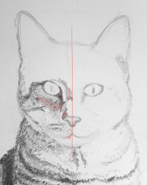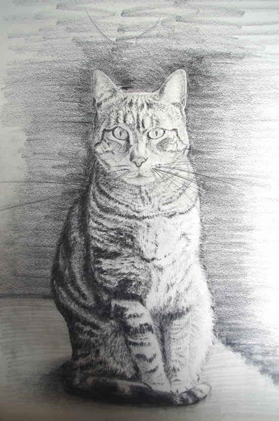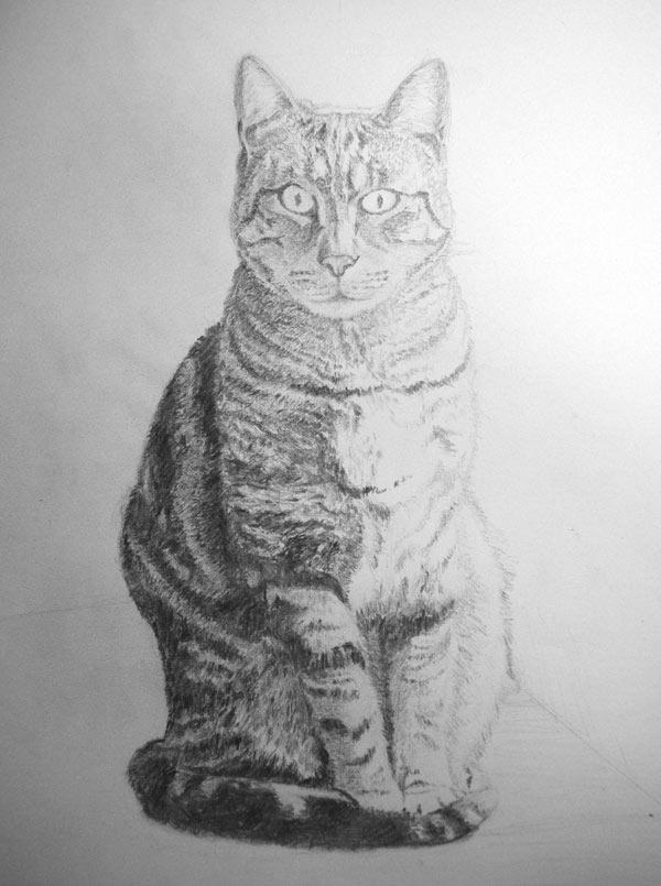 Pour finir de dessiner votre chat, procédez de la même façon que pour les étapes précédentes, en tenant compte de la lumière ( la partie gauche est plus sombre que la partie droite).
