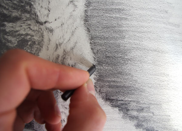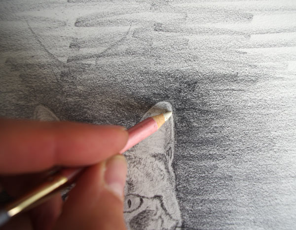 J’ai ensuite utilisé une gomme fine pour rehausser les zones lumineuses des oreilles et du pelage côté droit.