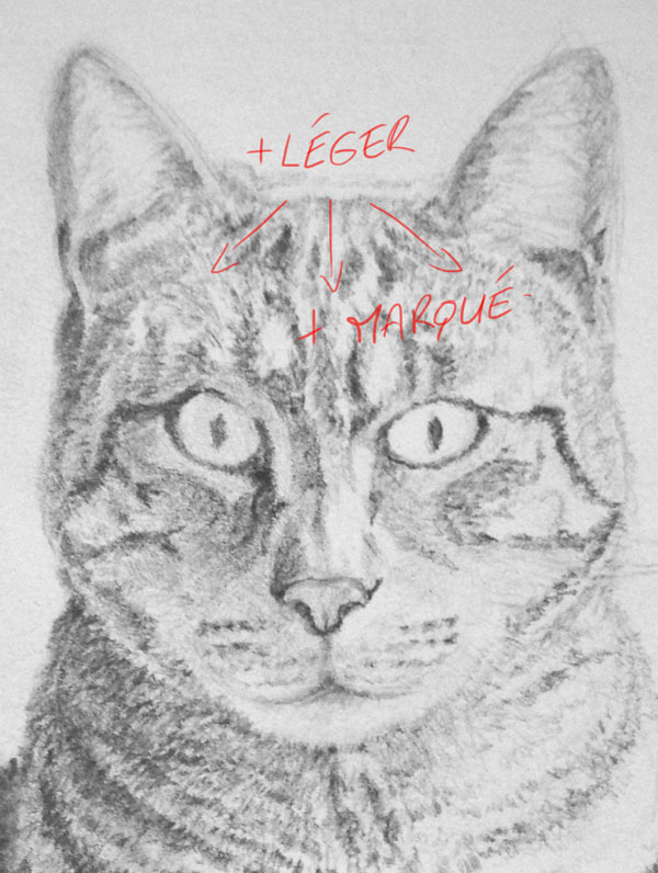 Pour le reste, procédez comme pour la partie basse du corps, toujours par petites touches, en variant la force de vos coups de crayons pour obtenir l’aspect chiné de la fourrure. Notons aussi que pour bien rendre le dessus de la tête, il est important de tenir compte de la forme du crâne assez plat et de la perspective. Pour obtenir cet effet, nous serons plus légers sur le dessin des stries entre les oreilles et nous les foncerons progressivement quand nous serons plus proches du centre du visage.