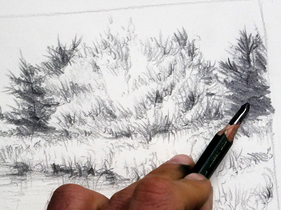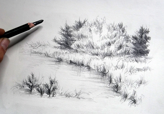 Pour simuler les végétaux, les coups de crayon doivent être légers par endroit, mais aussi plus appuyés pour souligner certaines ombres. Ils doivent partir un peu dans tous les sens.