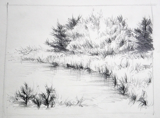 2- Contrairement à beaucoup de réalisations, ici il n’y a aucune ligne directrice apparente. Horizon, bord de l’eau, tout est suggéré par la hachure uniquement.Ce principe rend le dessin moins rigide et plus léger.